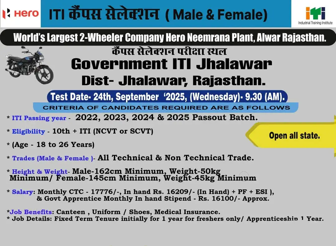Hero Neemrana Plant, Alwar (Rajasthan) is organizing a campus selection for ITI passed students. This opportunity is open for 2022, 2023, 2024 and 2025 batch Male and Female candidates. The campus selection will be held on 24 September 2025 (Tuesday) at 09:30 AM.